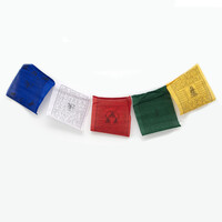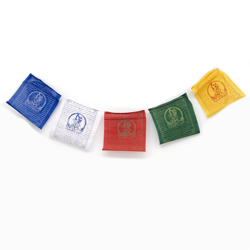 Tibetan prayer flags have 5 different colours representing the 5 elements of the earth. Red color - fire, green - wood, yellow - earth, blue - water, white - metal. Each flag carries the Buddha's teachings (mantras and sutras) and a representation of White Tara. Tara is widely revered by Tibetans, many consider her to be the protector of the Tibetan people.
