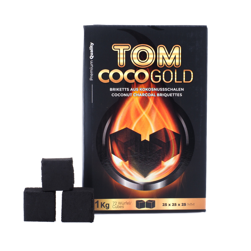 Natural coconut coal for hookah smoking or barbecue, Tom Coco, is made from coconut shells, which are a by-product of coconut oil production. It is a 100% natural and organic product, and no chemicals were used in its production and not a single tree was cut down for its making! Tom Coco Coals burn beautifully without an unpleasant smell and smoke, it also has a higher heat output value (up to 2 times longer burning time) than other usual coals. The residual ash content is up to 80% lower than other conventional coals, making up only 3% of its content in total. Tom Coco Gold has a very high solid charcoal content, averaging 85%.