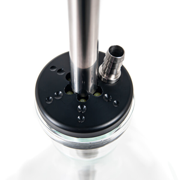 An unconventional integrated system of four purge valves is located at the heart of the hookah, which is complemented by a stainless steel hose port. You can easily slide the hose onto the steel port, with no need for grommets. There is also an easily removable diffuser at the end of the steel downstem.