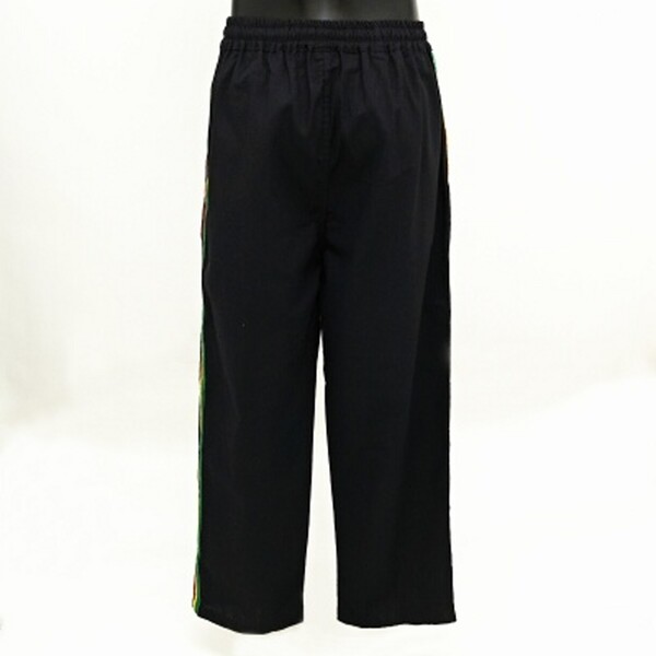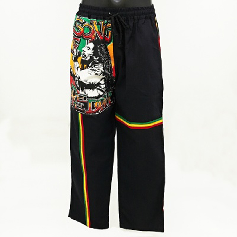 Comfortable black cotton trousers with Bob Marley singing motif, decorated with rasta tricolour.