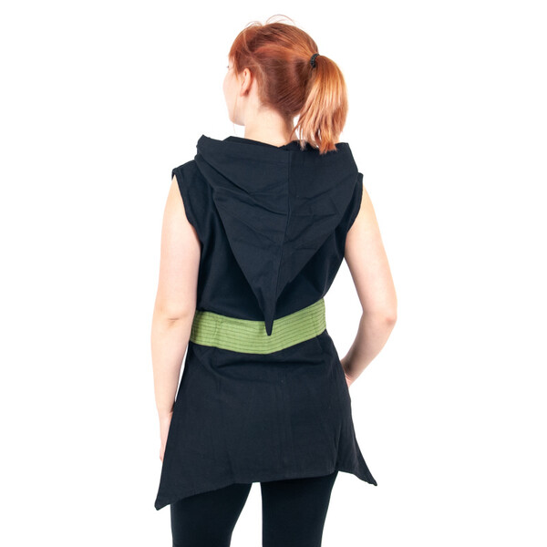 Women's tunic in "A" shape with tips that exceed the length of the tunic by 15cm. It has a zipper closure and a V-shaped hood.