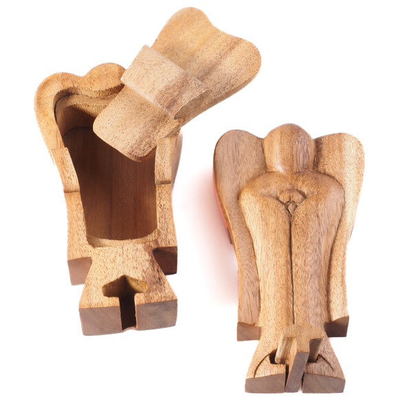 An extraordinary wooden chest from the exotic island of Bali, hand-carved into the shape of An angel with an ingenious closure system, securely storing your jewelry, treasures, and secrets.