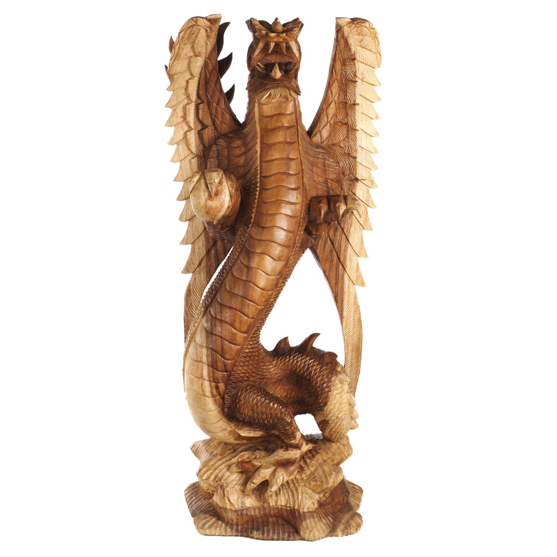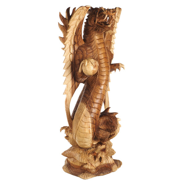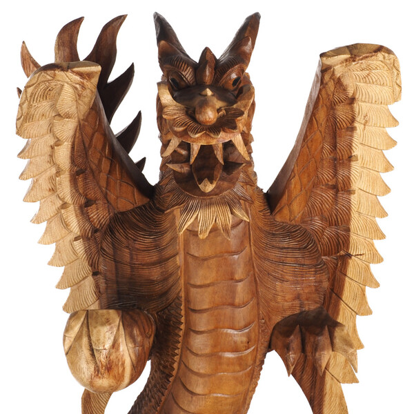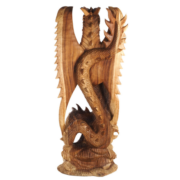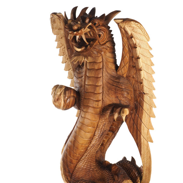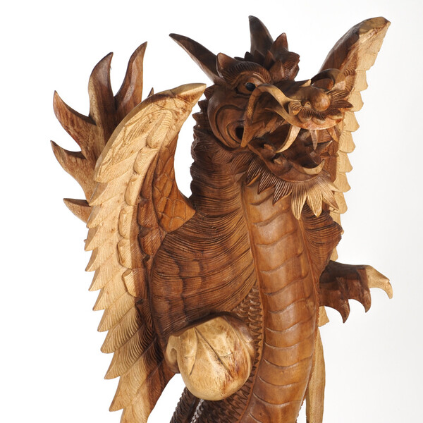 Dragon is considered a sacred animal in many traditional cultures. According to legend, the dragon protected the island of Bali from invaders and danger. The dragon motif conveys strength, courage, prosperity and good fortune. The dragon is believed to be the guardian of the gods and devotedly protects the sanctity of the home. The feather that the dragon holds is a symbol of wisdom and spiritual energy. The material itself - wood - also carries symbolic weight. In many cultures, it represents growth, transformation and connection with nature. Natural imperfections give each sculpture character and personality.