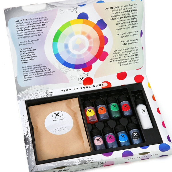 Translucent colours, glitter or pastel colours. Are you one of those people who just need them all and preferably mix them together to create more and more shades of colour? The XSchischa All in One set is just for you, offering you the possibility to create your own shades of colours, add glitter or create pastel colours. Depending on the amount of paint you use, you can use them to light up up to 250 pipes with just the right amount of colour. The instructions in the package will help you with the correct way to use them.