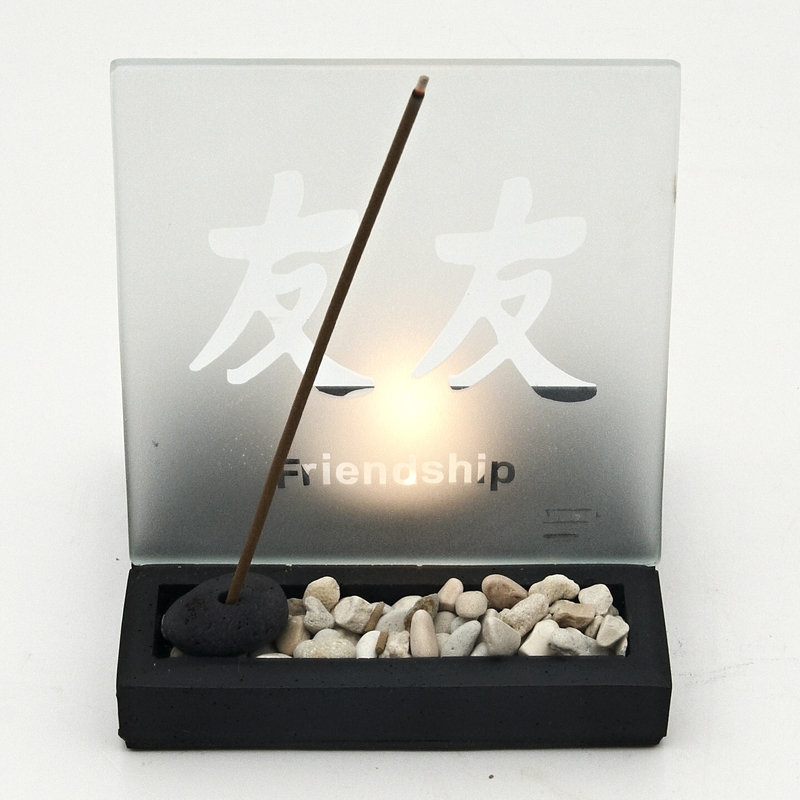 A magical Zen garden for tealight candles. The Chinese character meaning friendship glows softly through the frosted glass plate. An incense stick holder in the front completes the pleasant atmosphere. A great gift for everyone, including yourself of course. Dimensions of the plate: 10 x 10 cm. The package includes: stone base with a tealight candle holder, glass plate, pebbles for the Zen garden, and an incense stick holder.