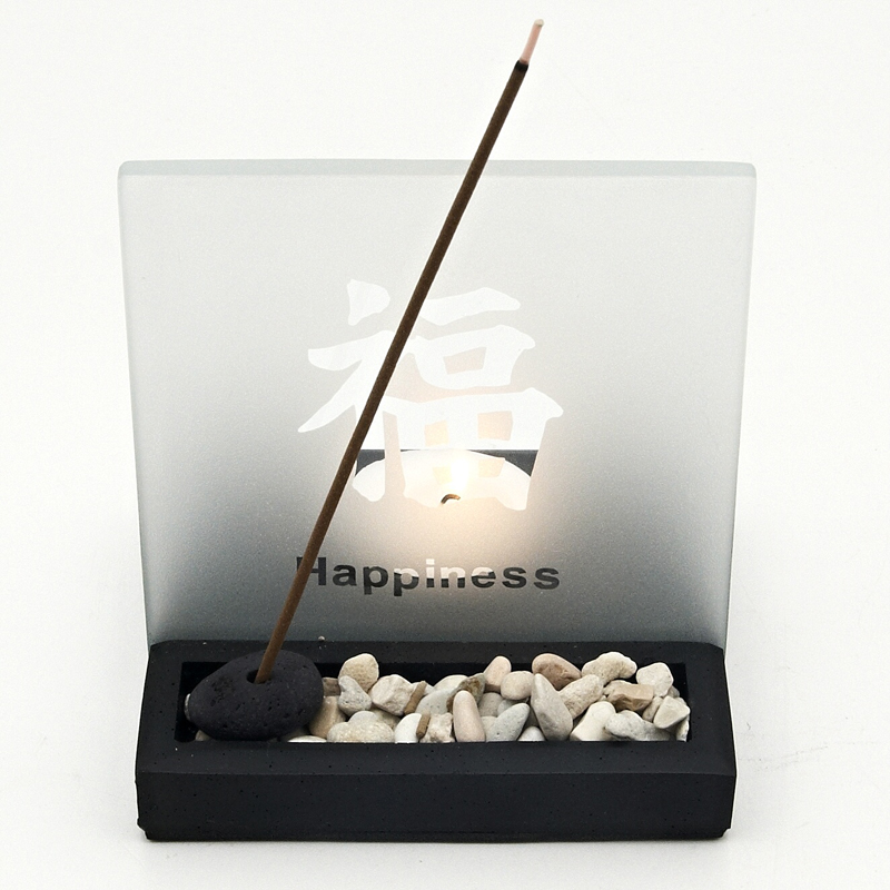 A magical Zen garden for tealight candles. The Chinese character that means happiness glows softly through the frosted glass plate. An incense stick holder in the front completes the pleasant atmosphere. A great gift for everyone, including yourself of course. Dimensions of the plate: 10 x 10 cm. The package includes: stone base with a tealight candle holder, glass plate, pebbles for the Zen garden, and an incense stick holder.